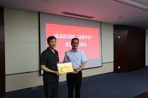 蘇勛海副院長現(xiàn)場向公司頒發(fā)了“法企同行聯(lián)系卡”牌匾,并表示連云區(qū)人民法院將進(jìn)一步暢通溝通渠道,通過“法企同行聯(lián)系卡”搭建溝通橋梁,共同努力打造“無訟企業(yè)”,實(shí)現(xiàn)企業(yè)和法院雙贏。