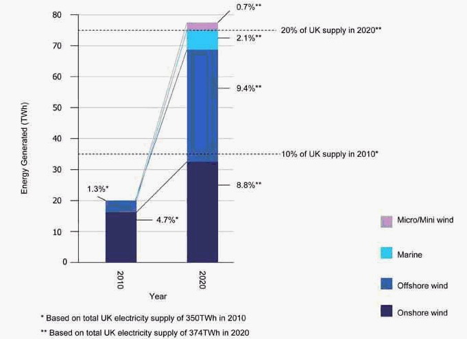 到2020年,英國可再生能源的發(fā)展規(guī)劃如下:1250萬千瓦的陸地風(fēng)電場(chǎng)裝機(jī)容量;1150萬千瓦的海上風(fēng)電場(chǎng)的裝機(jī)容量;300萬千瓦的海洋可再生能源。