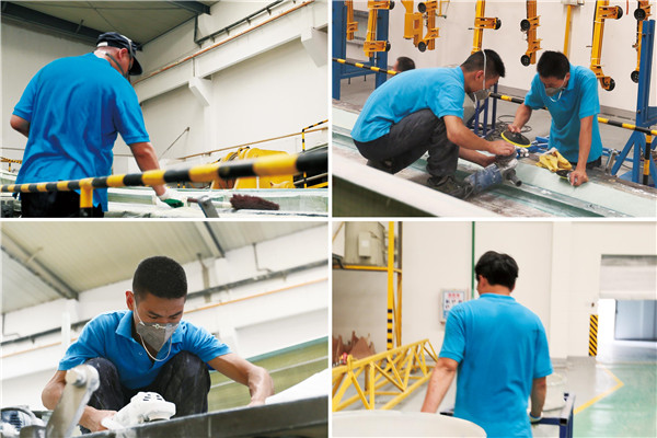 但這個“收拾”卻用了近半小時,這是工人們與自己較勁的半小時,檢查并確保每一項工作、每一個細節(jié)都暫停無誤才離開崗位;而這種“較勁”精神如同浸透衣衫帽檐的汗水,被滿滿傾注在每道工序里,模具處理、殼體鋪層、殼體注膠、殼體固化、殼體清理、合模、補強、葉片表面處理……