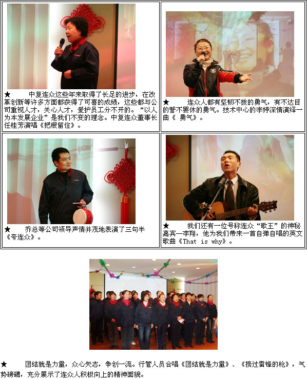 在主持人的優(yōu)美的開場白后,中復連眾2007年元旦聯(lián)歡會揭開了序幕。聯(lián)歡會的節(jié)目五彩繽紛,驚喜連連,下面分別是這次聯(lián)歡會的精彩片斷: