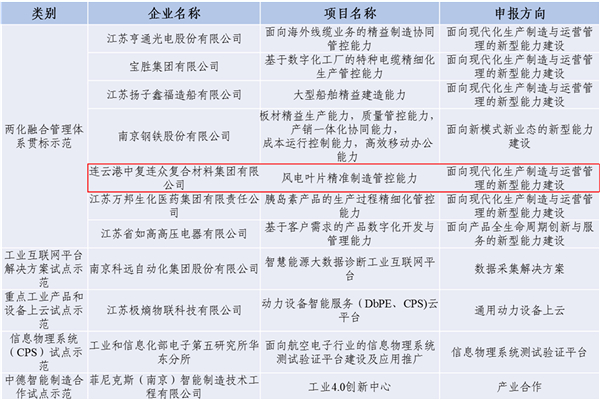 2018年8月10日,工信部公布了《2018年制造業(yè)與互聯(lián)網(wǎng)融合發(fā)展試點(diǎn)示范項(xiàng)目名單》,項(xiàng)目總計(jì)立項(xiàng)125個,江蘇省11個項(xiàng)目入圍。其中,中復(fù)連眾所申報(bào)的“風(fēng)電葉片精益制造管控能力” 項(xiàng)目成功入選兩化融合管理體系貫標(biāo)示范項(xiàng)目。